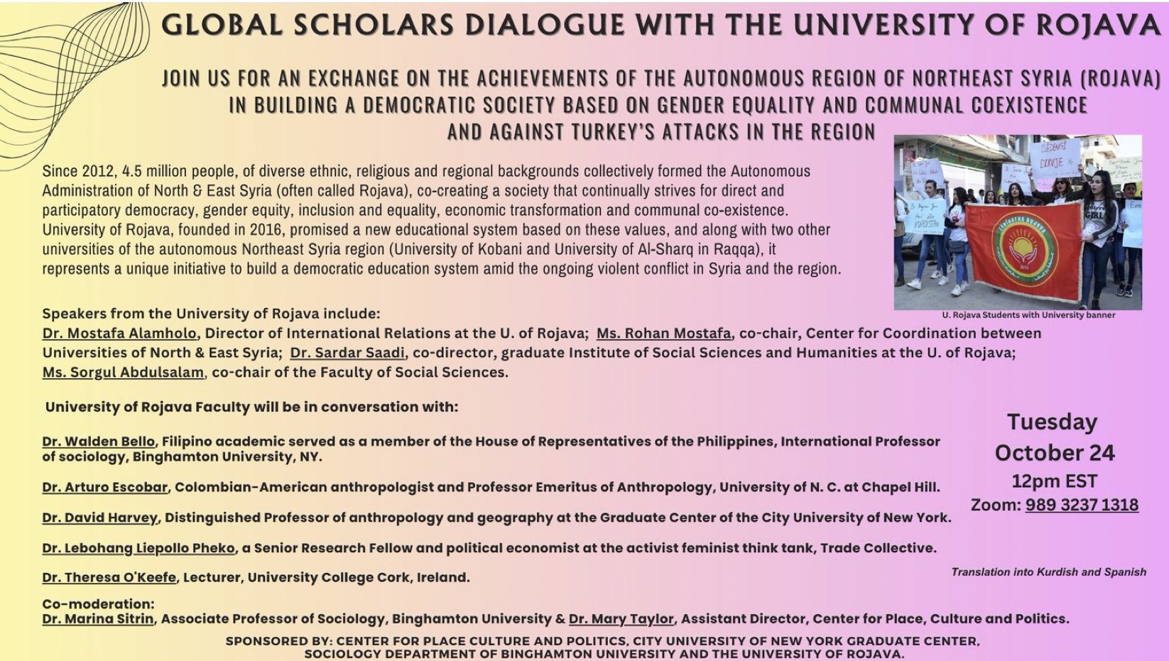 This event is sponsored by the Center for Place, Culture and Politics at the CUNY Graduate Center, the Sociology Department of Binghamton University and the University of Rojava. It is free and open to the public.